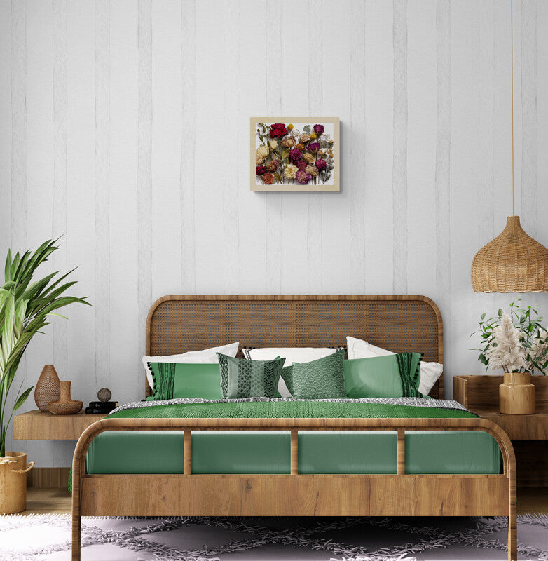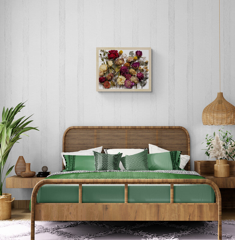 Imagine a canvas adorned with delicate roses, graceful dahlias, whimsical billy buttons, and rustic gum nuts, each meticulously arranged to create a breathtaking 3D composition.