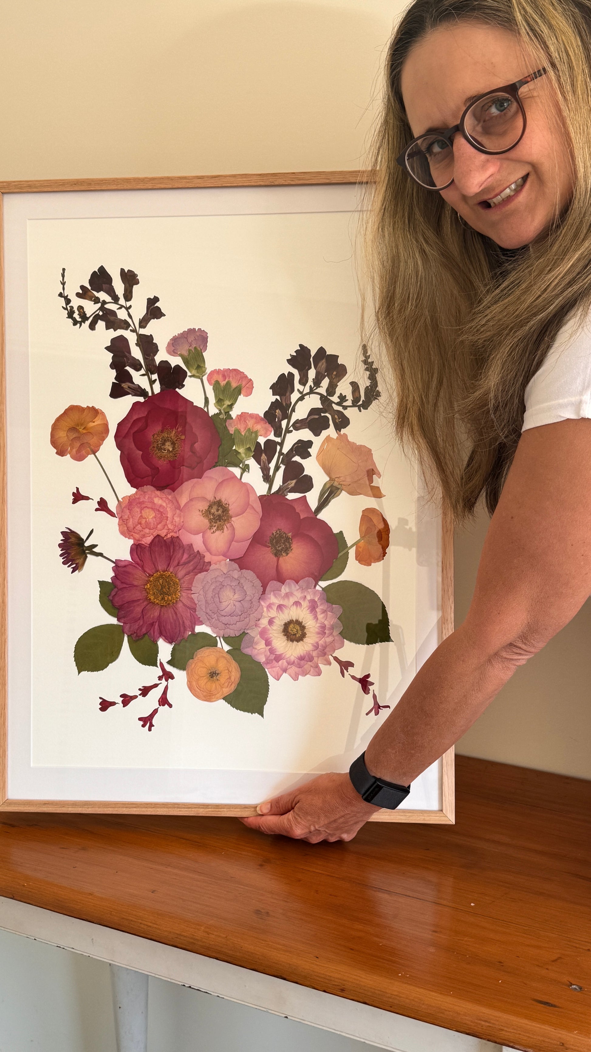 Fiesta Flora is a joyful celebration of colour and beauty, inspired by the vibrant floral artist, Courtney from Fiesta Flora. Originally created with bold hot pink roses, pink dahlias, and glowing orange ranunculus, this pressed flower artwork captures the energy of a true floral fiesta.