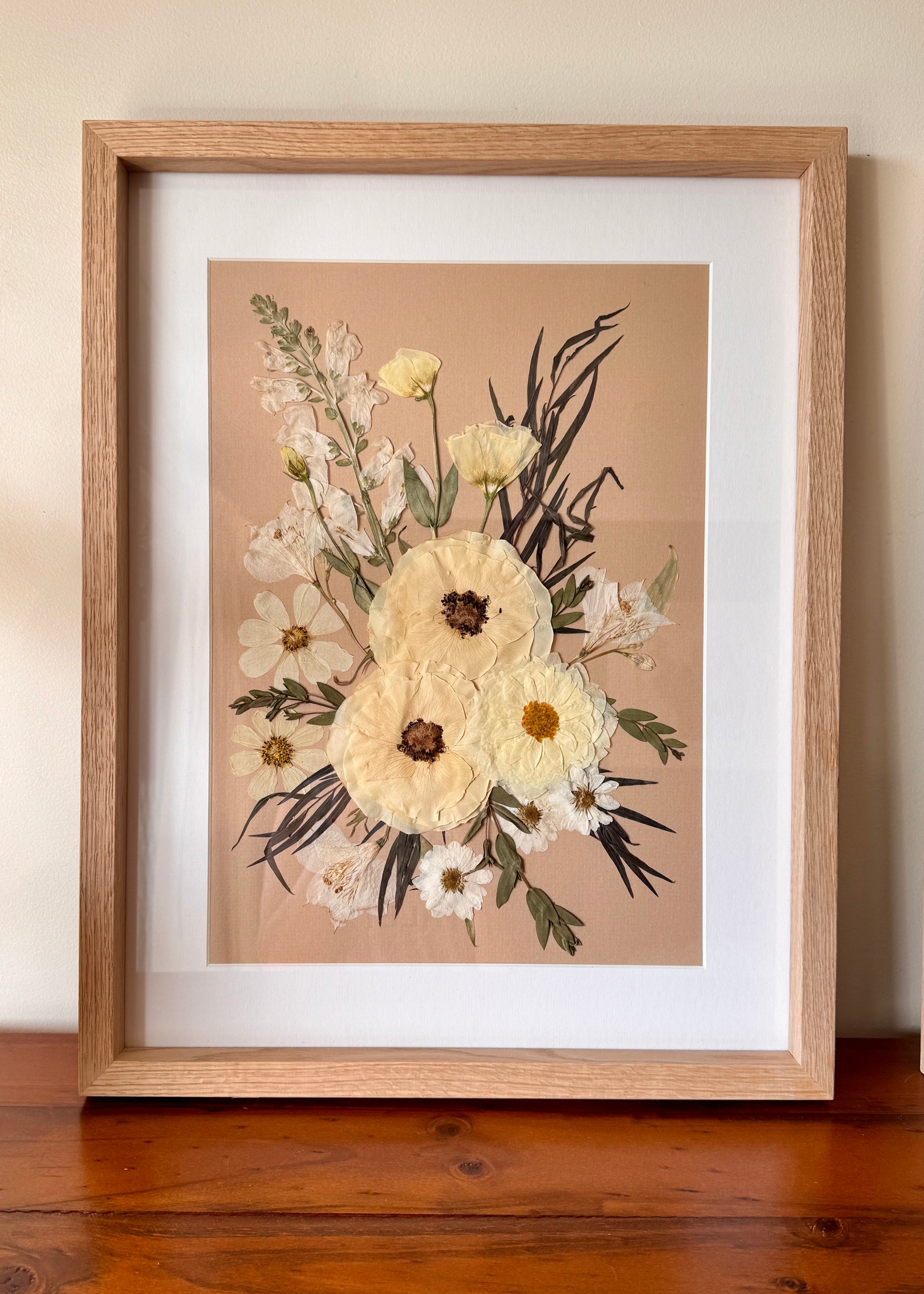 ✅ Framed original pressed flower artwork, OR an A3 timber or soldered metal frame with your vows and real pressed florals