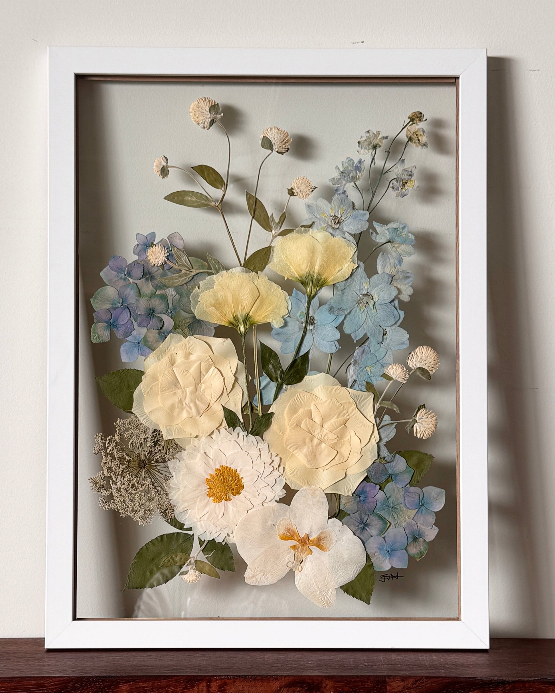 Note the Flower Preservation Fee (FPF of $220) is purchased initially to secure the booking and covers the preservation of your flowers. The frame price shown above (excl FPF) is paid when the artwork design begins, 5-9 months after your event