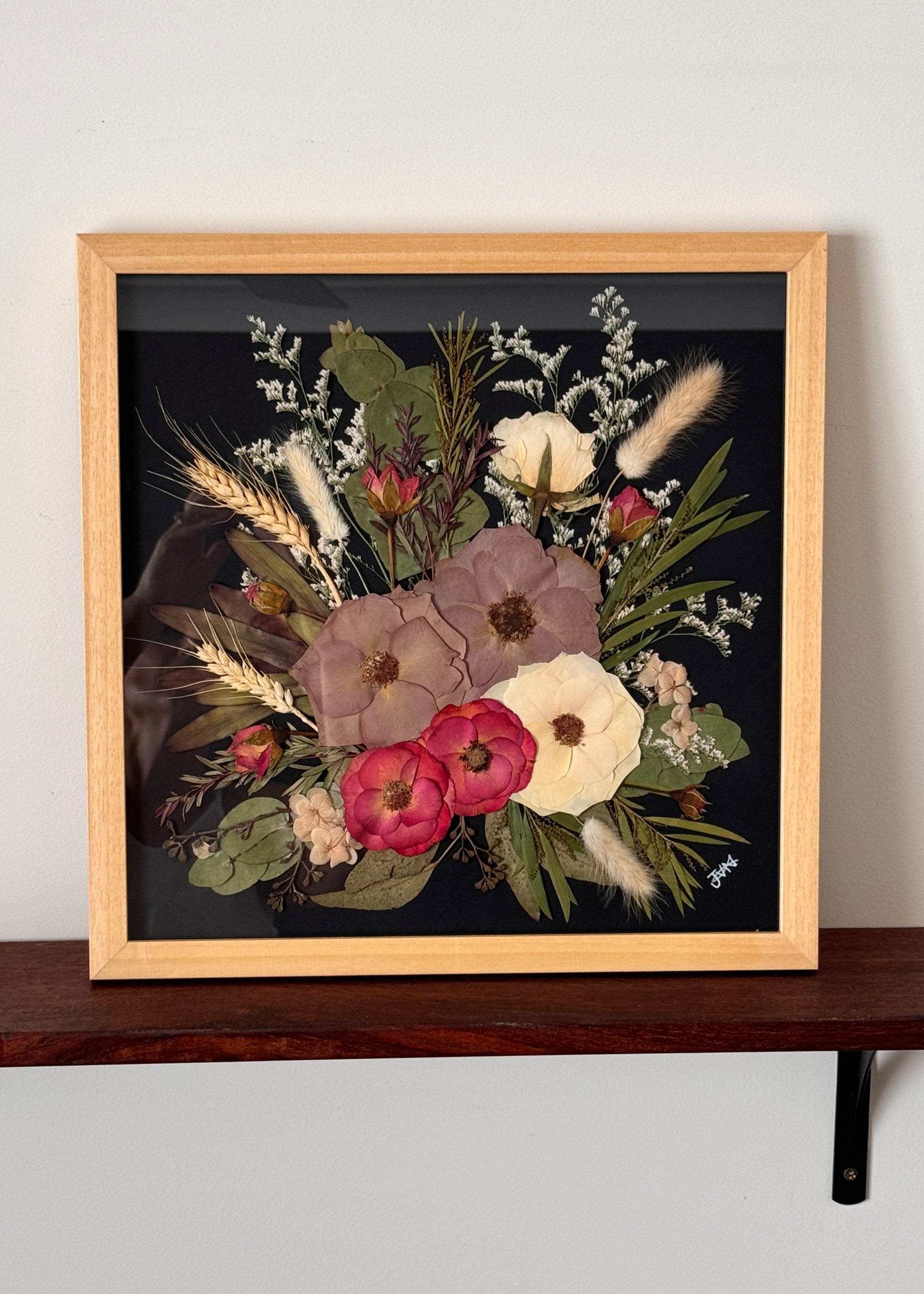 Transform your wedding flowers into a stunning keepsake with our Deluxe Square Timber Frame. This elegantly handcrafted frame, made by a local Sunshine Coast framer, is perfect for preserving medium-sized bouquets in a timeless and artistic display.